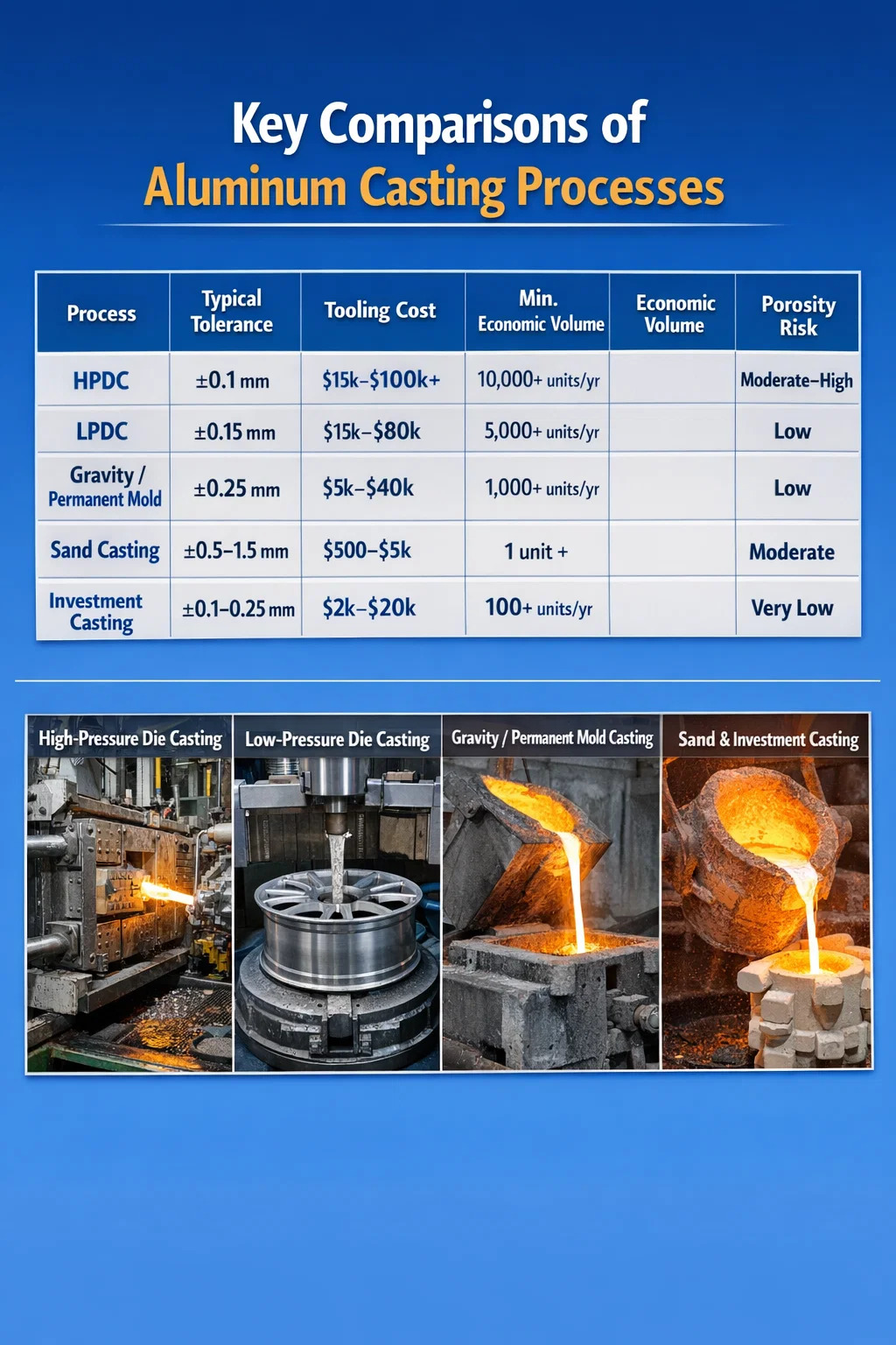 | Process | Typical TOLERATIO | Tooling Sumptus | Min. Volumen oeconomicum | Porosity Risk |