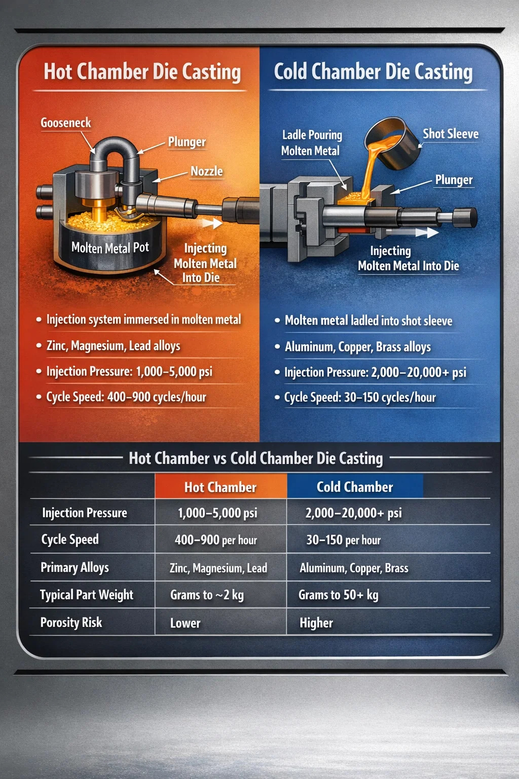 Duo methodi fundamentales mori mittentes sunt calidum cubiculum mori mittentes and frigidus thalamum mori mittentes . Hi duo processus eandem metam fundamentalem communicant — cogente metallo fusili in chalybe obdurato sub alta pressione decedente ad partes praecisas, iterabiles producendas — sed significanter differunt quomodo metallum liquefactum, tractatum et injectum. Methodum pravam eligens pro tua offensione vel ex parte geometriae in pauperes satietatem, immoderatam porositatem, praematura mori indumentum, et pretiosos exiguo rates provenire potest. Intellectus quid separat hos duos modos sit principium pro quolibet gravi mori mittentes sententiam.
